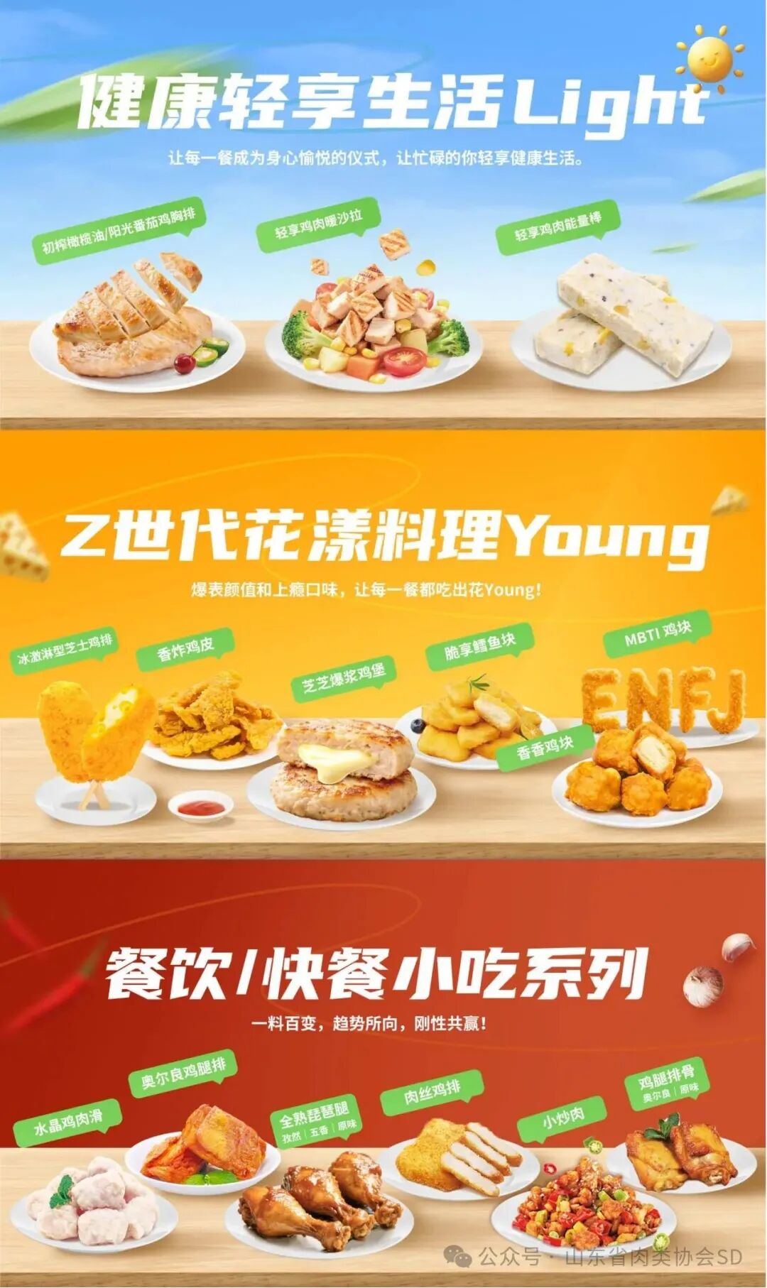 其中,针对餐饮性价比需求,推出了刚性需求快餐小吃系列(奥尔良鸡腿排、肉丝鸡排、鸡腿排骨奥尔良味、鸡腿排骨原味、原味琵琶腿、孜然琵琶腿、五香卤味鸡腿、小炒肉、水晶鸡肉滑),解决中西餐及团膳菜单痛点;围绕年轻群体与情绪消费,推出花漾料理(MBTI鸡块、脆享鳕鱼块、冰激淋型芝士鸡排、香炸鸡皮、芝芝爆浆鸡堡、香香鸡块)、轻享生活系列(初榨橄榄油鸡胸排、阳光番茄鸡胸排、轻享鸡肉能量棒、轻享鸡肉暖沙拉),同时增加日式烧鸟串系列(日式烧鸟鸡皮串、日式烧鸟腿肉串、日式烧鸟腿肉葱串)和无抗系列产品,满足多元口味和需求,同步推进包装迭代升级,增强品牌辨识度。