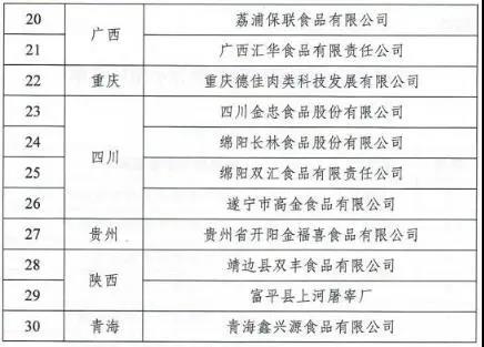 根据《农业农村部办公厅关于深入推进生猪屠宰标准化创建工作的通知》(农办医〔2018〕26号)要求,按照质量管理制度化、厂区环境整洁化、设施设备标准化、生产经营规范化、检测检验科学化、排放处理无害化的总体要求,经屠宰企业自愿申请、省级主管部门遴选、部级专家审查评审,现确定北京二商肉类食品集团有限公司等30家企业为全国生猪屠宰标准化示范厂并颁发标牌。请各地强化对标准化示范厂的监管与指导,切实发挥示范带动效应,全面提高屠宰行业标准化水平,提升肉品质量安全保障能力。